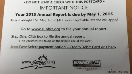 It is now 2015 and Florida Corporations and Limited Liability Companies will be required to renew their Annual Reports with the Florida Division of Corporations. Annual Reports are required to be filed before May 1st, 2015 to avoid a $400 penalty. The State of Florida DOC sends out notification emails that many contractors either disregard